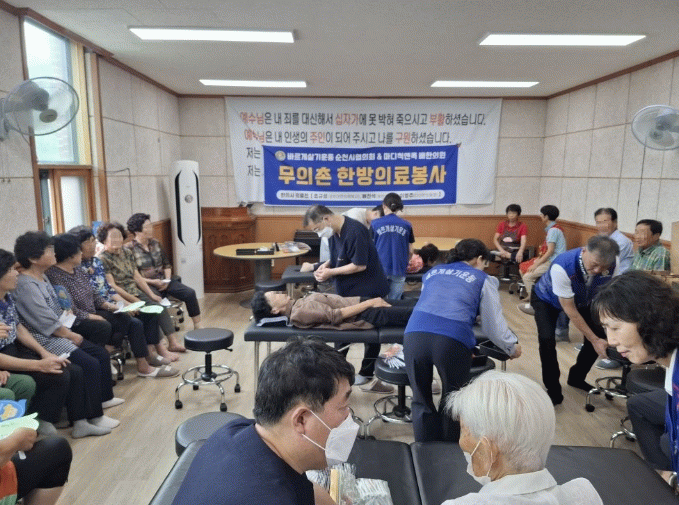 비좁은 마을 회관 대신 용림교회 예배당을 빌려 넓고 쾌적한 곳에 임시 진료소를 마련하고, 배진석 배한의원장, 조규성 경희대한의학박사, 이병주 강진다산한의원장이 한방 침 치료, 뜸, 부항치료, 한약복약지도, 여름철 건강관리 유의사항 등 다양한 한방진료를 제공하며 무더위에 지친 어르신들의 건강을 살폈다.