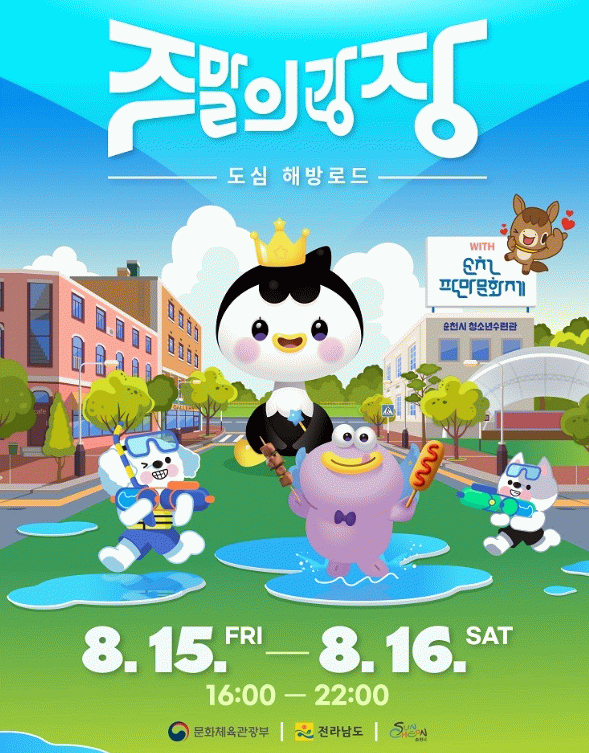 지난 주말의 광장 트레이드마크였던 ‘잔디로드’가 다시 한 번 자동차가 오가던 문화의 거리를 초록빛 휴식 공간으로 바꾸고, 문화의 거리 내 위치한 승주 주차장은 물총태그 서바이벌 공간으로 재구성해 더운 여름을 시원하게 즐길 수 있도록 했다.