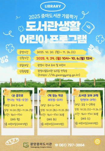 운영 강좌는 ▲유아 5~6세 대상 ‘손 끝으로 만나는 가을’ ▲유아 6~7세 대상 ‘책 읽는 작은 쉐프들’ ▲초등 1~2학년 대상 ‘도서관 꼬마 과학 탐험대’ 3개다.