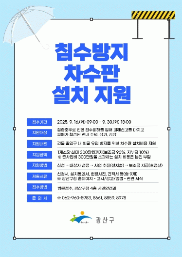 차수판(물막이판) 설치 지원사업은 건물 출입구 내 빗물 유입 차단을 위해 광산구가 차수판(물막이판) 설치 비용을 지원하는 사업이다.