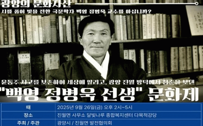 강연 주제는 ‘백영 정병욱 선생과 우리 문화 예술의 뿌리’로, △이성웅 전 광양시장(정병욱 선생 집안과 광양의 인연) △임주탁 부산대 교수(백영의 학문적 업적) △채희완 민족미학연구소장(백영의 풍류와 멋)이 발표를 맡는다.