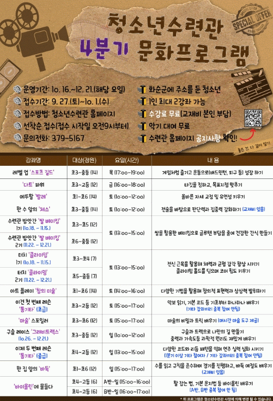 운영 프로그램은 ▲레벨 업 ‘스포츠’ ▲‘다트’ 파워 ▲에뚜왈 ‘발레’ ▲한 수 앞의 ‘체스’ ▲수련관 방앗간 ‘쌀 베이킹’ ▲터치 ‘클라이밍’ ▲아트 플레이 ‘창의 미술’ ▲‘통기타’ 초급 ▲‘마술’ 스포일러 ▲구슬 레이스 ‘그래비트랙스’ ▲‘통기타’ 중급 ▲한 집 앞의 ‘바둑’ ▲‘바이올린’에 물들다 등 총 13개 프로그램으로 청소년들의 눈높이에 맞춘 실습형 중심 수업으로 진행될 예정이다.