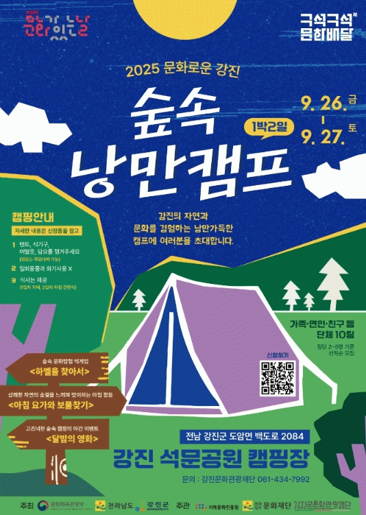문화체육관광부가 주최하고 지역문화진흥원이 주관하는 이번 행사는 가족·연인·친구 단위 참가자를 대상으로 강진의 생태와 문화, 역사를 함께 체험하는 1박 2일 힐링 문화캠프다.
