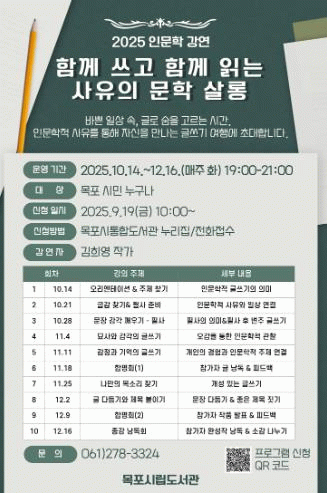 참가 신청은 오는 9월 19일 오전 10시부터 목포시통합도서관 누리집에서 접수 가능하며, 자세한 사항은 목포시립도서관으로 문의하면 된다.