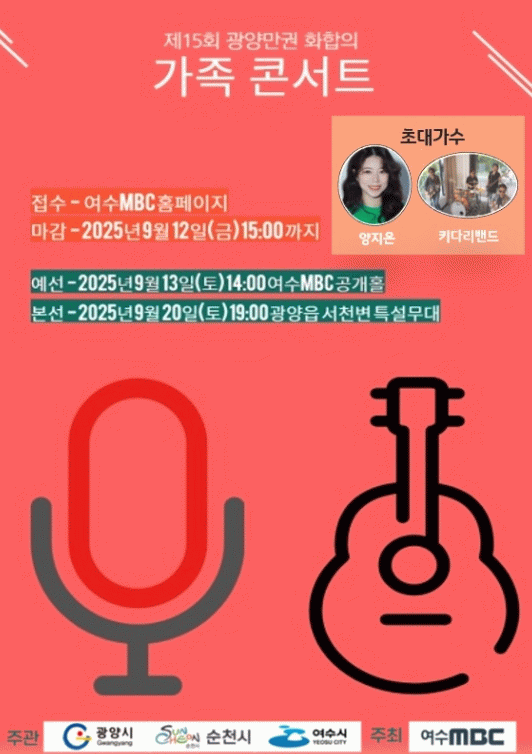 광양시 관계자는 “가족, 친구, 직장 동료 등 일상의 팀들이 음악을 통해 하나 되는 무대는 단순한 경연을 넘어 지역 공동체 문화의 소중한 본보기”라며 “많은 시민 여러분의 참여를 바란다”고 말했다.