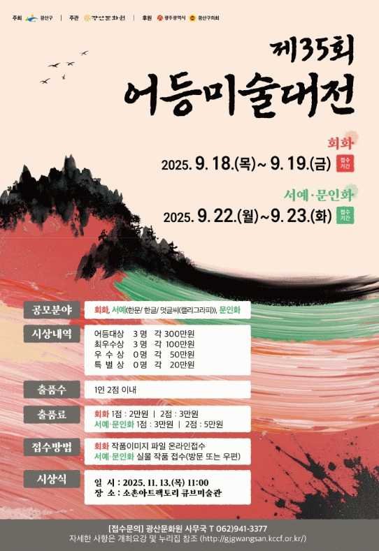 회화는 19일까지 전자우편으로 접수하고, 서예·문인화는 22일부터 23일까지 광산문화원(광산구 상무대로 265, 2층)에서 방문 또는 우편접수하면 된다.