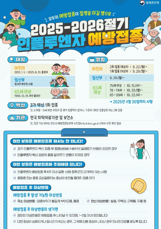 이어 ▲6개월 이상 13세 미만 어린이(1회 접종 대상자)와 임신부(주수 상관없이)는 9월 29일부터, ▲65세 이상 어르신은 10월 15일부터 접종을 시작하여 내년 4월 30일까지 지속한다.