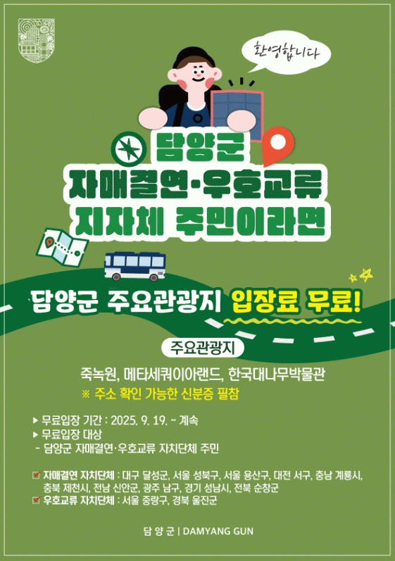 무료입장이 관광지는 담양의 대표 명소인 ▲죽녹원 ▲메타세쿼이아랜드 ▲한국대나무박물관 3곳이며, 자매결연·우호교류 도시 주민임을 확인할 수 있는 신분증 등 증빙서류를 제시하면 된다.