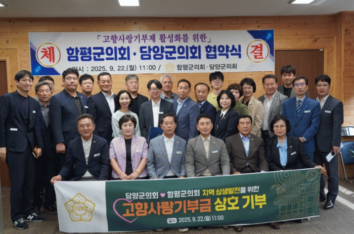 이번 상호 기부는 담양군의회와 함평군의회 의원과 직원 34명의 참여로 총340만의 기부금을 모아 상호 간 지역 발전을 위한 다양한 사업에 쓰일 수 있도록 지원하는 것으로, 의회 차원에서의 고향사랑 실천과 함께 기부 문화 정착을 위한 취지로 마련됐다.