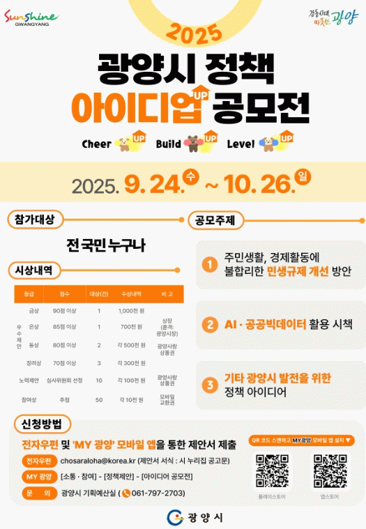 공모전 명칭은'광양시 정책 아이디업(UP) 공모전'으로, 시민들의 삶을 응원하고(Cheer up), 더 나은 정책을 함께 만들어(Build up), 광양시가 한층 더 높이 도약하는(Level up) 계기를 마련하고자 기획됐다.