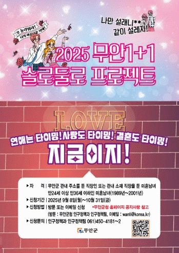 이번 솔로둘로 프로젝트 참가 대상은 무안군 거주 직장인 또는 군내 직장을 둔 미혼남녀(1989~2001년생, 만 24~36세)이며, 신청은 2025년 9월 8일부터 10월 31일까지, 방문 또는 이메일로 신청할 수 있다.