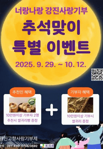 강진원 강진군수는 “여름 행사의 성원에 힘입어 한가위 맞이 고향사랑기부 이벤트를 준비했다”며 “세액공제와 답례품 기본 혜택에 더해 강진 쌀귀리를 받아보시길 바란다”고 말했다.