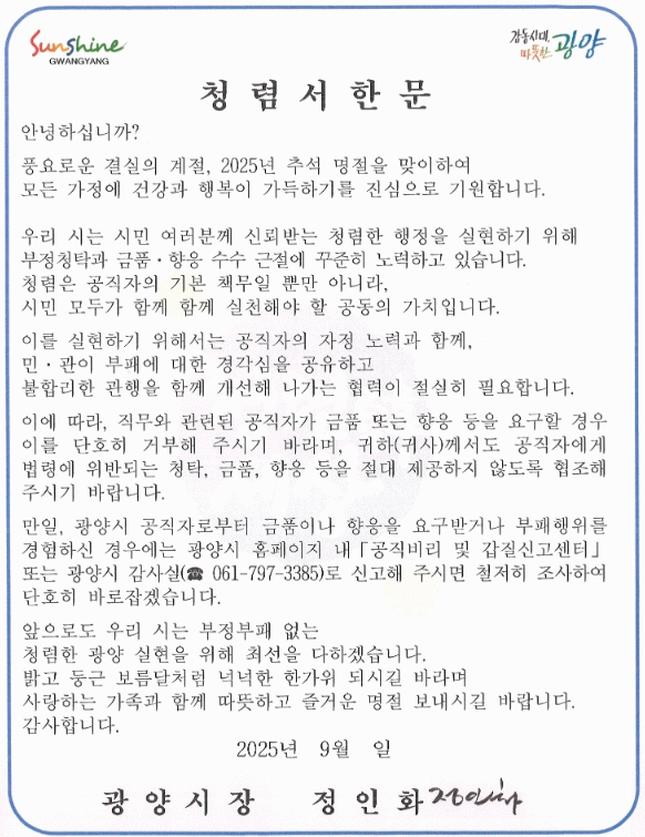 한편, 시는 이번 서한문 발송 외에도 추석 명절을 맞아 청렴캠페인 전개, 청렴주의보 발령, ‘청탁금지법 바로알기’ 홍보 등 다양한 청렴 활동을 추진하고, 부패 예방과 공직기강 확립을 위한 특별 감찰도 병행할 계획이다.