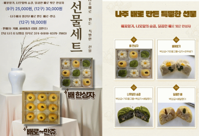 국내산 쌀가루, 백앙금, 거피팥고물, 흑임자, 감자, 배 말랭이 등 엄선된 재료를 사용해 고소하면서도 산뜻한 풍미를 자랑하며 각각 배꽃, 나뭇잎, 배 모양을 형상화해 시각적인 즐거움까지 선사한다.