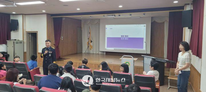 이인회 군내파출소장과 임동찬 순경은 최근 발생한 초등학생 유괴 미수 사건과 청소년을 대상으로 하는 각종 범죄 사례 등을 소개하며, 학생 눈높이에 맞춘 교육을 진행했다.