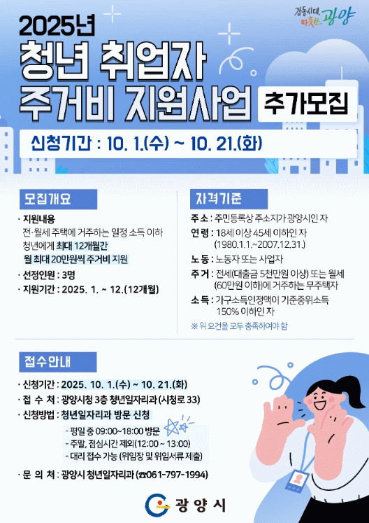 지원 자격은 광양시에 주소를 둔 18세 이상 45세 이하 청년 노동자 및 사업자로, ▲가구소득인정액이 기준중위소득 150% 이하이고 ▲전세 대출금 5천만 원 이상 또는 월세 60만 원 이하인 주택에 거주하는 무주택자여야 한다.