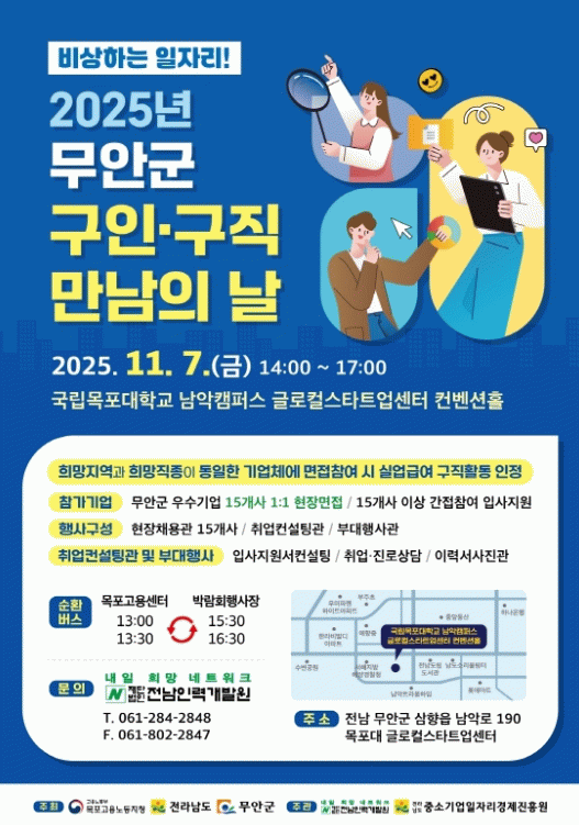 ‘비상하는 일자리’라는 주제로 무안군이 주최하고 전남인력개발원이 주관하는 이번 행사는 구직자와 관내 우수기업 간 만남을 통해 구직자에게 취업기회를, 구인업체에는 인재채용의 기회를 제공하기 위해 열리는 원스톱 일자리 지원사업의 일환이다.
