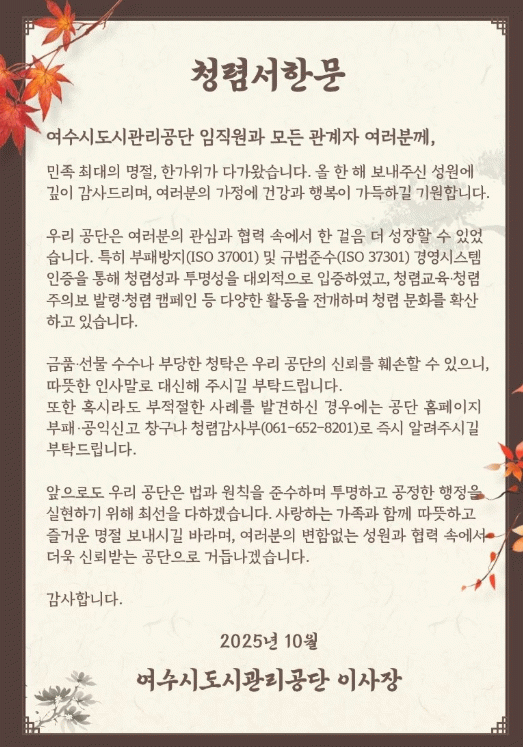 공단은 서한문을 통해 한 해 동안의 성원에 감사 인사를 전하고, 금품·선물 수수나 부당한 청탁 대신 인사말로 마음을 전해줄 것을 당부했다.