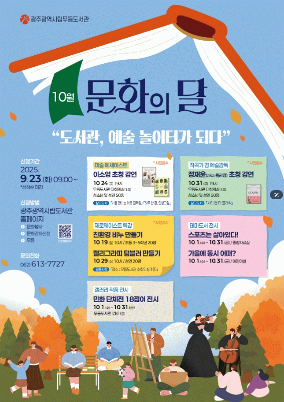 무등도서관은 10월 한달 간 가을·책 주제 ‘민화 단체전’과 자료실 테마도서 전시를 연다. 오는 24일 아트컬렉터 이소영(미술 에세이스트)의 ‘현대미술 클로즈업!’, 31일 예술감독 정재윤(aka 쥴리정)의 ‘문학 속 음악의 장면들’, 19일과 29일에는 ‘제로웨이스트 특강’으로 친환경 비누 만들기와 캘리그라피 텀블러 만들기 체험 행사를 운영한다.