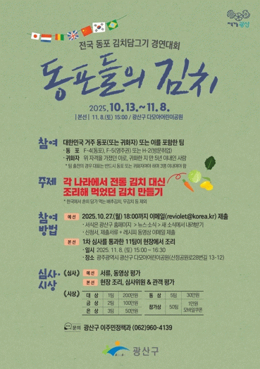 13일부터 27일까지 전자우편으로 신청서와 김치 조리 과정을 담은 5분 분량의 동영상을 제출하면 된다. 필요 서식은 광산구 누리집 새소식 란에서 확인할 수 있다.
