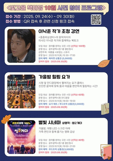 한편 ‘빛고을 책마당’ 일부 프로그램은 사전 예약제로 운영되며, 광주문화예술통합플랫폼 ‘디어마이광주’를 통해 신청 가능하다. 자세한 사항은 광주시 문화유산자원과로 문의하면 된다.