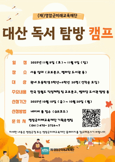 대산 독서 탐방 캠프에 대한 자세한 내용은 영암군과 영암군미래교육재단 홈페이지에서 볼 수 있고, 안내는 영암군미래교육재단 기획운영팀에서 한다.