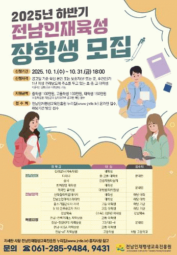 신청기한은 31일까지며, 전남인재평생교육진흥원 누리집에서 온라인으로 신청하거나 해당 기관에서 방문 접수하면 된다.