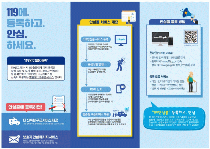 서비스 등록은 119안심콜 누리집 또는 가까운 소방서를 통해 가능하며, 등록 이후에는 언제 어디서나 119 신고 때 자동으로 정보가 연계돼 최적의 응급처치를 받을 수 있다.