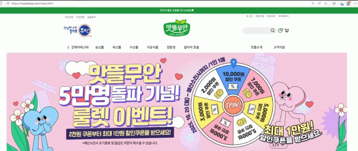 10월 20일부터 시작되는 룰렛 이벤트는 ‘맛뜰무안몰’ 회원 누구나 참여할 수 있으며, 룰렛을 돌려 최대 1만원의 할인쿠폰을 무작위로 제공한다.