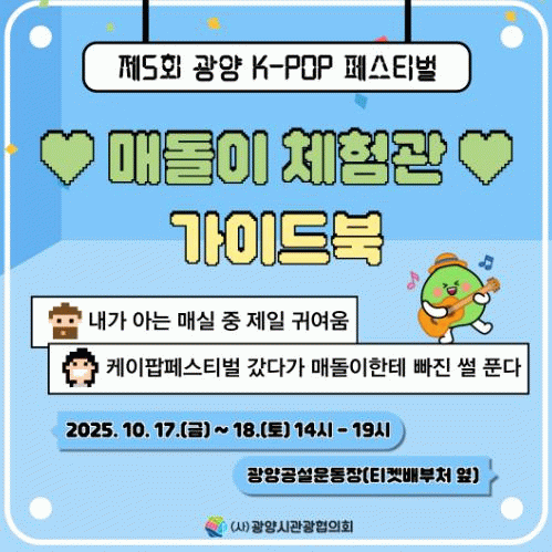 ‘매돌이 체험관’은 광양의 대표 캐릭터 ‘매돌이’를 주제로 한 오감형 체험 공간으로, 오는 10월 17~18일 광양공설운동장에서 열리는 페스티벌의 현장 분위기를 한층 고조시킬 전망이다.