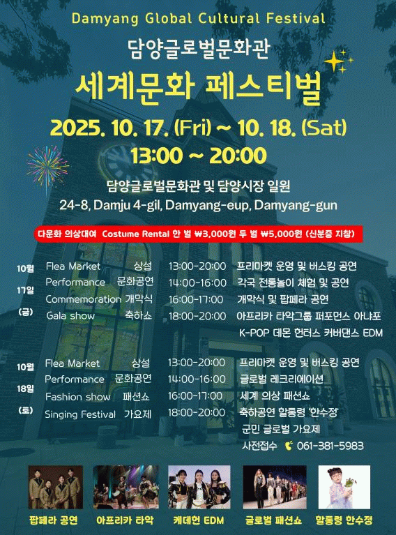 군 관계자는 “이번 축제가 다문화 가족과 군민, 방문객이 세계 여러 나라의 문화를 함께 체험하고 소통하는 계기가 되길 바란다”며 “앞으로도 담양글로벌문화관이 지역 사회의 문화 다양성을 확산시키는 중심 공간이 되도록 노력하겠다”라고 말했다