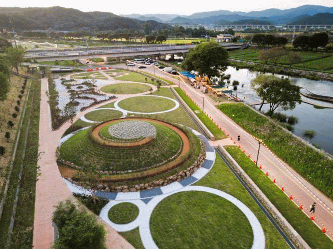 옛 공설운동장 부지에 장성 잔디를 심고, 강변 쪽에는 음악 분수와 상설 무대를 설치했다.