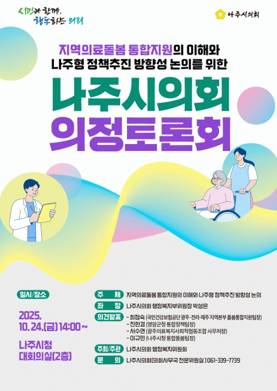 토론회는 박성은 나주시의회 행정복지위원회 부위원장이 좌장을 맡아 진행되며, 최점숙 국민건강보험공단 광주·전라·제주지역본부 돌봄통합지원팀장, 진한겸 전라남도 영암군청 통합정책팀장, 서수연 광주의료복지사회적협동조합 사무처장, 이규민 나주시청 통합돌봄 팀장의 의견발표로 진행될 예정이다.