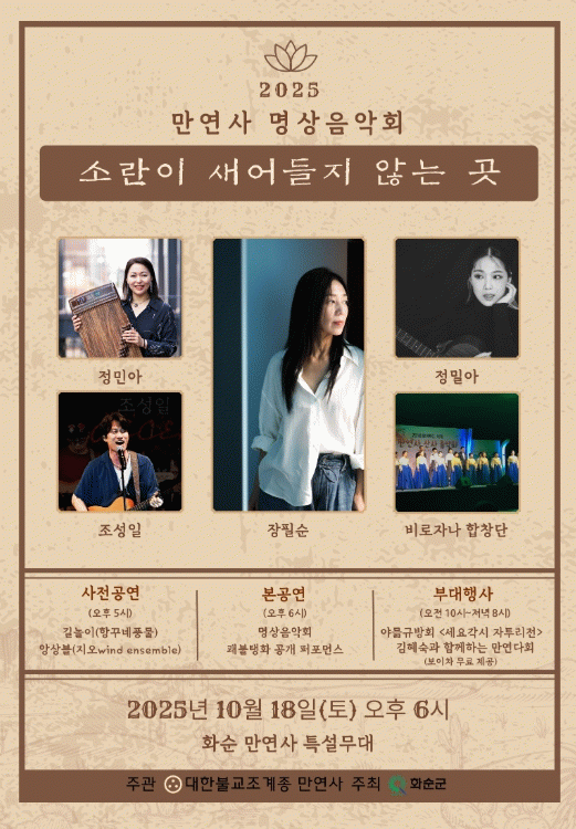 화순군이 주최하고 만연사가 주관하는 이번 산사음악회는 1208년 설립된 천년고찰 만연사의 운치 있는 풍경을 배경 삼아 ‘소란이 새어들지 않는 곳’이란 주제의 명상음악회를 통해 마음자리를 들여다보는 시간으로 기획됐다.
