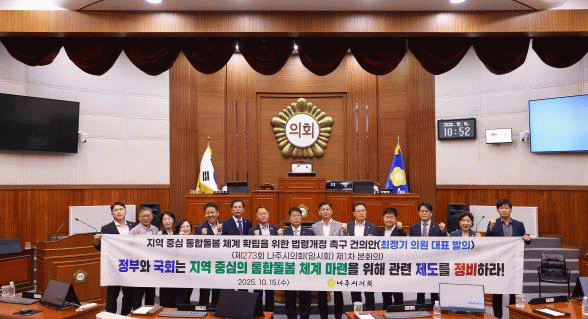 나주시의회는 이번 건의안을 통해 ▲지방자치단체가 통합돌봄 계획 수립·실행·판정 주체가 될 수 있도록 법적 근거를 명확히 하고, 국민건강보험공단 중심의 위탁 체계를 철회할 것 ▲ 전담조직 신설, 인력 배치 등을 수행하기 위해 국가 재정지원 체계 및 표준 모델 마련 할 것 ▲다직종 거버넌스 구축을 위한 제도적 지원 확대할 것을 촉구했다.