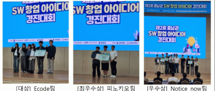 전남대 소프트웨어중심대학사업단은 예선을 통해 ▲Ecode팀 ▲피노키오팀 ▲Notice now팀을 본선에 진출시켰으며, 세 팀 모두 SW/AI 기술을 활용한 혁신 창업 아이디어로 심사위원단의 높은 평가를 받았다.