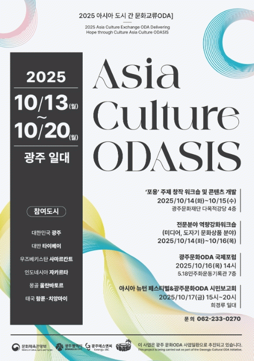 ‘광주형 문화 공적개발원조(ODA)-아시아 컬쳐 오다시스(Asia Culture ODASIS)’는 광주를 중심으로 ▲몽골 울란바토르 ▲인도네시아 자카르타 ▲태국 람푼·치앙마이 ▲우즈베키스탄 사마르칸트 ▲대만 창화 등 아시아 6개국 7개 도시의 청년예술가 70여 명이 참여하는 국제 문화예술 협력사업이다. 이들은 도시재생, 지역 특화 문화상품 개발, 미디어아트 등 다양한 협업프로젝트를 추진했다.
