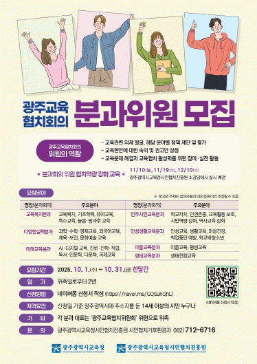 ‘광주교육협치회의’는 지역사회와 함께하는 시민협치 활성화를 위해 지난 2023년 1기를 모집했다. 시민협치진흥원은 1기 위원의 임기가 오는 10월 31일 종료됨에 따라 2기 위원을 모집한다.