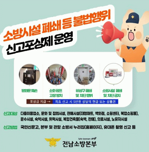 신고포상제는 다중이용시설이나 숙박시설 등에서 발생할 수 있는 소방 관련 불법행위를 군민이 직접 신고해 개선을 유도하는 제도로, 지역 안전문화 정착을 위한 군민 참여형 제도다.
