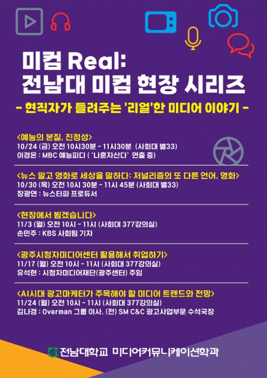 20일 전남대에 따르면 미디어커뮤니케이션학과는 10월 24일부터 11월 24일까지 ‘미컴 Real: 전남대 미컴 현장 시리즈’를 개최하고, 방송·저널리즘·영화·광고·미디어 공공기관 등 다양한 분야의 실무 전문가들을 초청해 생생한 현장 경험과 취업 전략을 전하는 특별 강연 릴레이를 진행한다.