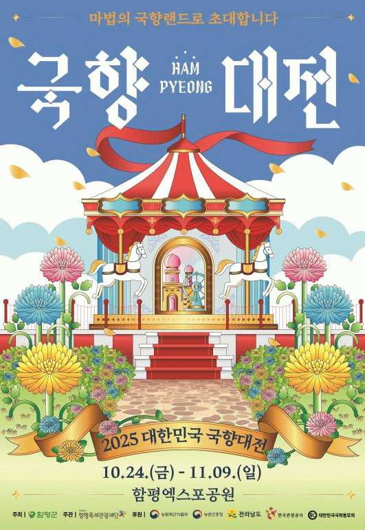한편, 2025 대한민국 국향대전은 오는 10월 24일부터 11월 9일까지 17일간 함평엑스포공원 일원에서 ‘마법의 국향랜드’를 주제로 회전목마와 대관람차, 마법의 성 등 대형 국화조형물과 명품 국화분재 작품 전시, 브라스밴드 거리공연, 마법의 휴먼포토 등 다양하고 생동감 있는 전시·공연·체험프로그램으로 관람객을 맞이할 예정이다.