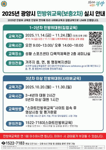 송명종 안전과장은 “민방위 사태 발생 시 즉각 대응할 수 있는 역량을 강화할 수 있도록 적극적인 참여를 부탁드린다”며 “교육을 미이수한 대원은 과태료 부과 등 불이익이 발생하지 않도록 기간 내 반드시 이수해 주시길 당부드린다”고 말했다.