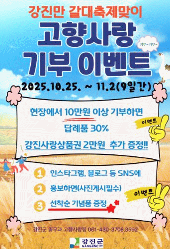 강진원 강진군수는 “무르익는 가을 정취를 강진만에서 즐기시고 고향사랑기부 이벤트로 혜택 누리기 바란다”며 “‘홀로사는 노인 클린-업’, ‘효심이 빨래방’이 기부금으로 진행돼 군민의 삶이 변화하고 있다.