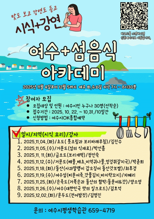 이기숙 여수시 평생교육과장은 “섬 음식은 여수의 자연환경과 생활문화가 어우러진 소중한 자산”이라며 “이번 아카데미가 시민들이 섬의 맛과 이야기를 직접 체험하고 2026여수세계섬박람회에서 여수의 음식문화를 세계인과 공유하는 계기가 되길 바란다”고 말했다.