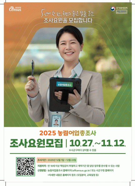 모집 기간은 10월 27일부터 11월 12일까지(17일간)이며, 만 18세 이상으로 농림어업총조사에 관심이 있고 통계조사 업무에 성실히 참여할 수 있는 사람은 누구나 지원할 수 있다.