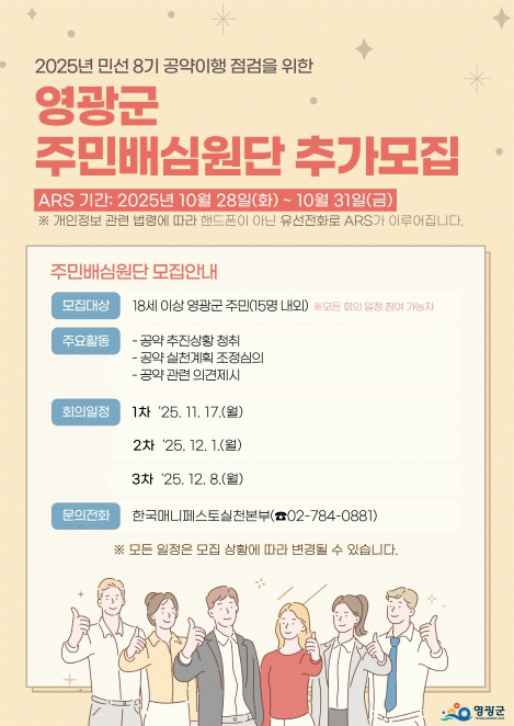 개인정보 보호 법령에 따라 핸드폰이 아닌 유선전화로 ARS를 진행하며, 18세 이상 영광군민을 대상으로 오는 10월 28일부터 10월 31일까지 ARS를 통해 무작위 추첨 후 본인의 의사를 확인하여 선발한다.