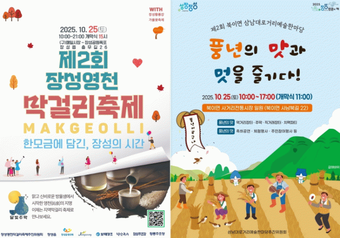 먼저 장성읍에선 전통 막걸리를 제대로 맛볼 수 있는 축제가 열린다. ‘제2회 장성 영천 막걸리축제’는 막걸리 주조장이 밀집되어 있던 장성읍의 역사성을 되살린 축제로, 지난해 큰 관심과 호응을 얻은 바 있다. 장성영천리막걸리축제추진위원회가 주최하고 장성읍이 주관한다.