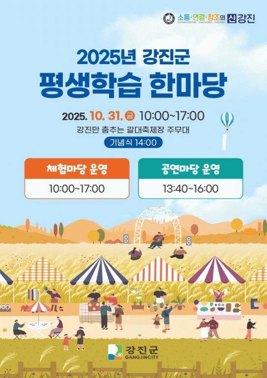 2025년 평생학습 한마당의 특징은 가을 대표 축제인 제10회 강진만 춤추는 갈대축제와 연계해 개최된다는 점이다. 이로써 배움, 자연, 문화가 결합된 지역 대표 생태 문화 축제로 자리매김할 것으로 기대된다.