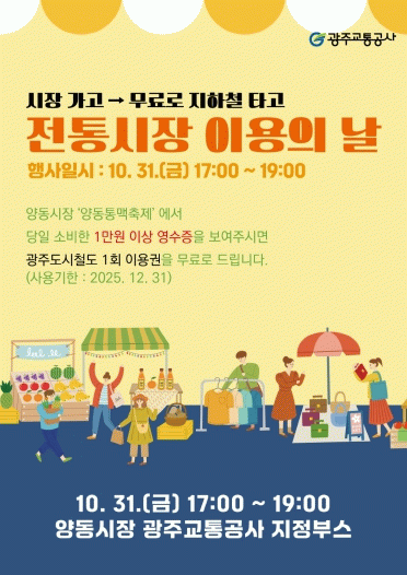 이번 이벤트는 광주의 대표 즐길 거리인 ‘양동통맥축제’와 연계해 진행 되며, 공사는 10월 31일 금요일 오후 5시부터 7시까지 축제 현장에서 당일 1만원 이상을 구매한 고객에게 오는 12월 31일까지 사용 가능한 도시철도 1회 무료 이용권을 증정한다.