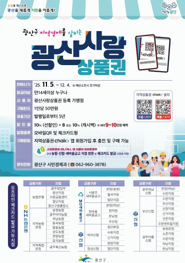 박병규 광산구청장은 “광산사랑상품권이 지역 내 소비 순환 구조를 강화하고 침체한 골목상권에 활력을 불어넣는 마중물이 되길 바란다”며 “많은 시민이 참여해 지역경제 회복에 함께해주길 바란다”고 말했다.